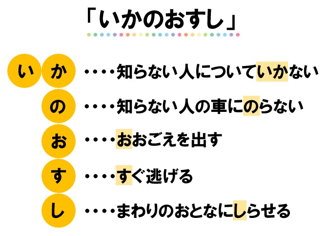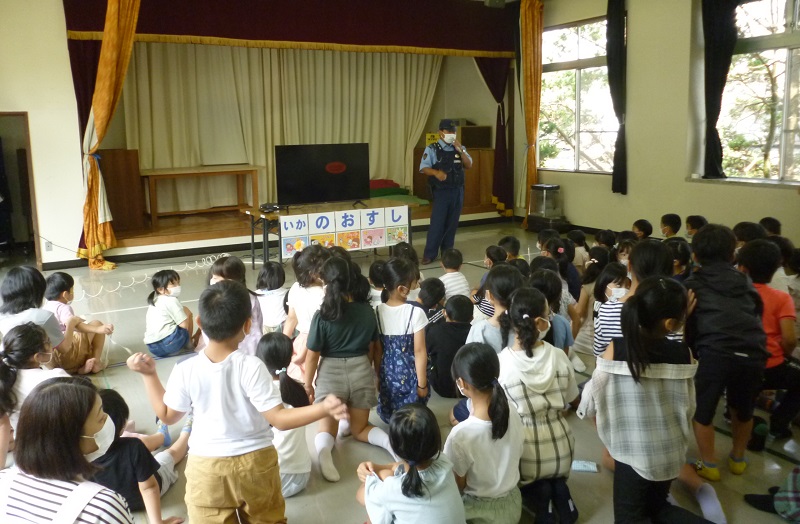 防犯教室2022.10.052022.07.27子どもたちの安全を守るため、7月27日、明神会館大集会室で「防犯教室」を開きました。 三原警察署宗郷駐在所の田中さんの指導で、DVDを見ながら、危険な所や不審者からの回避方法を学びました。 また、「いかのおすし」(誘拐などから子ども自身が身を守るための行動をまとめた標語)についても教えていただきました。これからも子どもたちの安全確保に万全を尽くしてまいります。